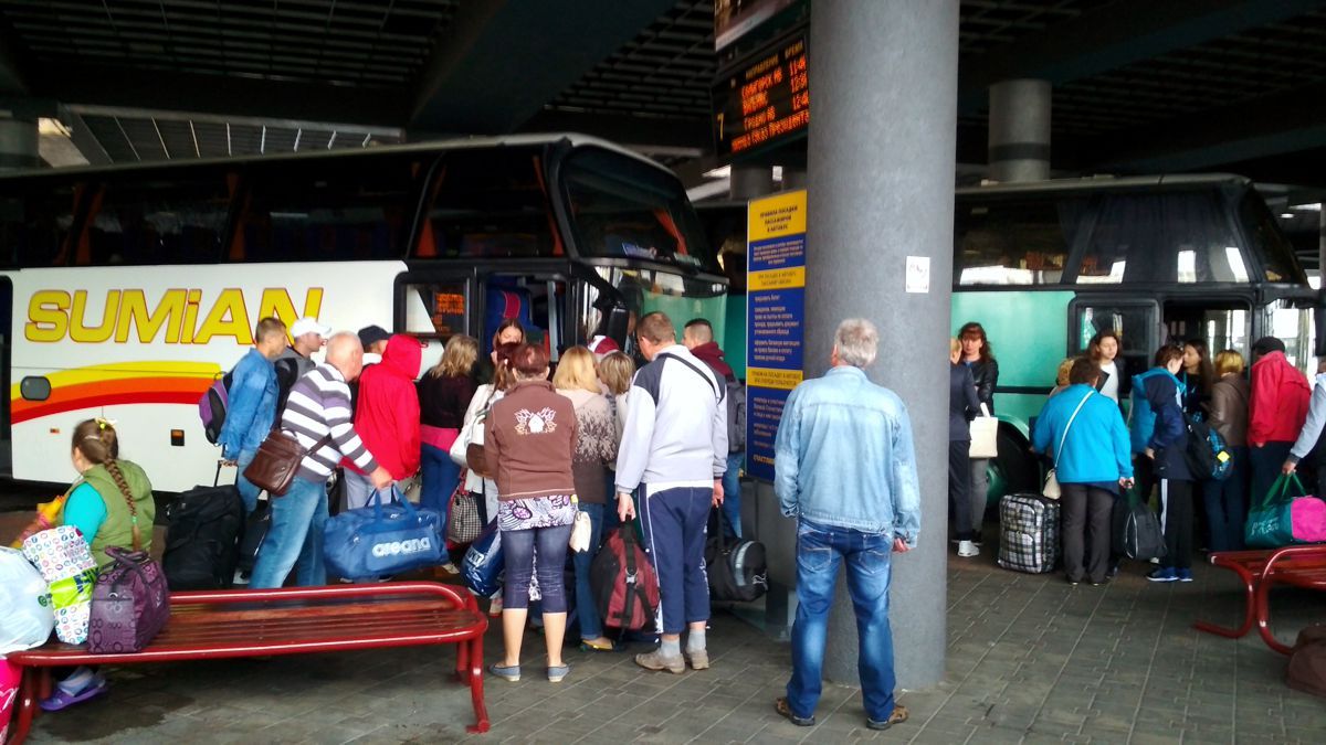 • Два наших автобуса на Затоку - идет посадка туристов